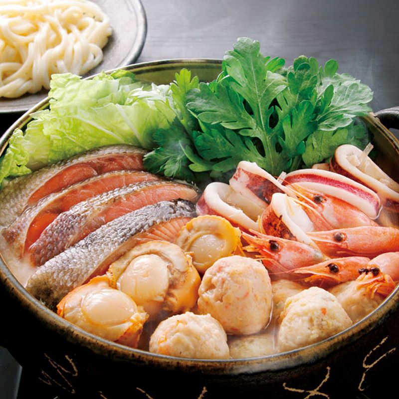 秋鮭切身(40g)×4、ボイル海老×12、ボイル帆立×6、かに入つみれ・えび入つみれ・とりごぼうつみれ×各3、ツボ抜きいか(100g)・冷凍うどん(250g)×各1、たれ(濃縮味噌仕立て)(50g)×2