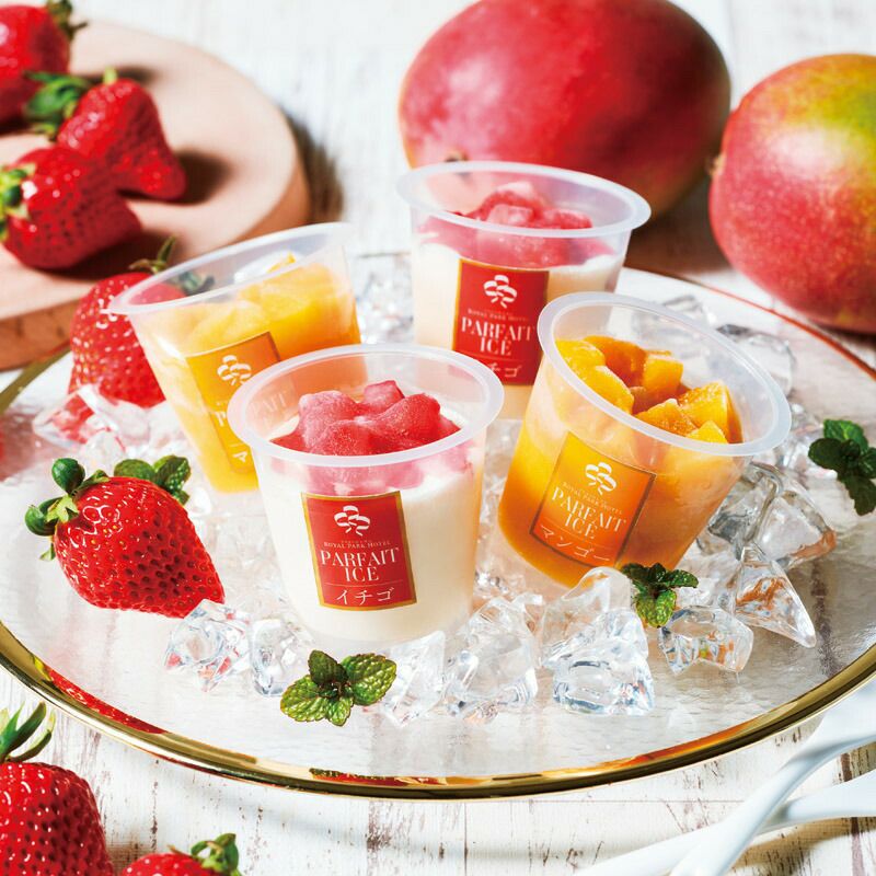 程よい甘さと酸味が特徴のパフェアイス 横浜ロイヤルパークホテル監修のイチゴとマンゴーのパフェアイスセットです。