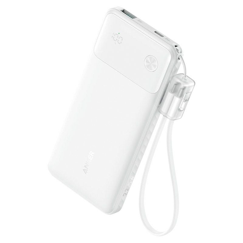 10,000mAhの大容量と最大22.5W出力を備えた急速充電対応モバイルバッテリー。USB-CとUSB-Aの2ポートを搭載し、iPhoneやAndroidを効率よく充電可能。内蔵ケーブルはストラップとしても使え、持ち運びに便利。