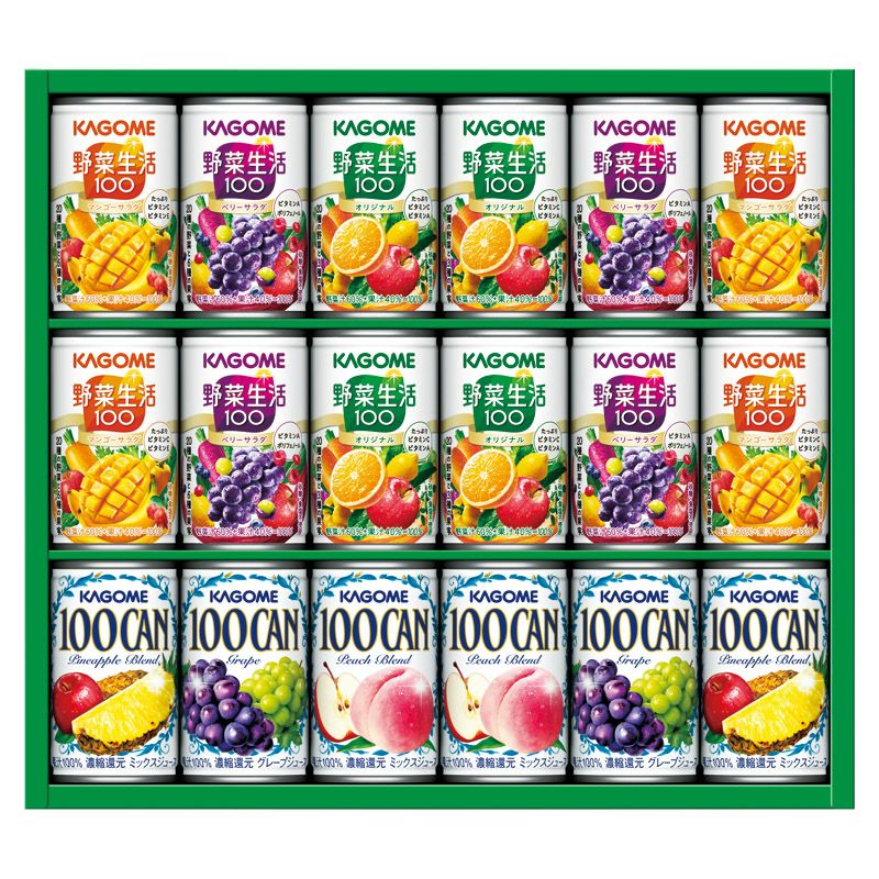 100%フルーツジュースのベストセラー「100CAN」と野菜&フルーツの美味しさが人気の「野菜生活100」の詰合せ。
