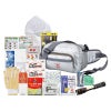 避難用ショルダー&ウエストバッグ(約120×260×160mm)×1、COB伸縮2WAYライト・ホイッスル・携帯トイレ(大小兼用)(2P)・ウェットティッシュ(20枚)・ポケットティッシュ・防寒アルミシート・軍手・マスク・レインコート・熱冷却シート(2枚入)・エイトバン(大小×各2)・防災ハンドブック・備蓄用飲料水(500ml)×各1、使い捨てカイロ×2