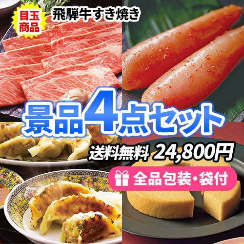 - 飛騨牛すき焼きをメインにちょっとしたイベントにも使える景品4点セット【商品引換券】【即納商品】【送料無料】