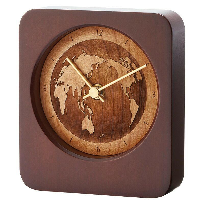 様々なテイストの部屋に不思議なほど馴染む、天然木を贅沢に使用した落ち着きのある風合いが特徴の置時計。世界地図やインデックスはレーザー加工を施したことによって、立体感と絶妙なニュアンスが生まれ味わい深い印象を与えます。