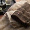 厚みたっぷりでボリューム感のあるホテル仕様で肌触りはとてもやわらかいのに丈夫な質感。環境負荷を少しでも減らすサステナブルな取組みとして、タオルを織る電力は太陽光発電でまかなっています。