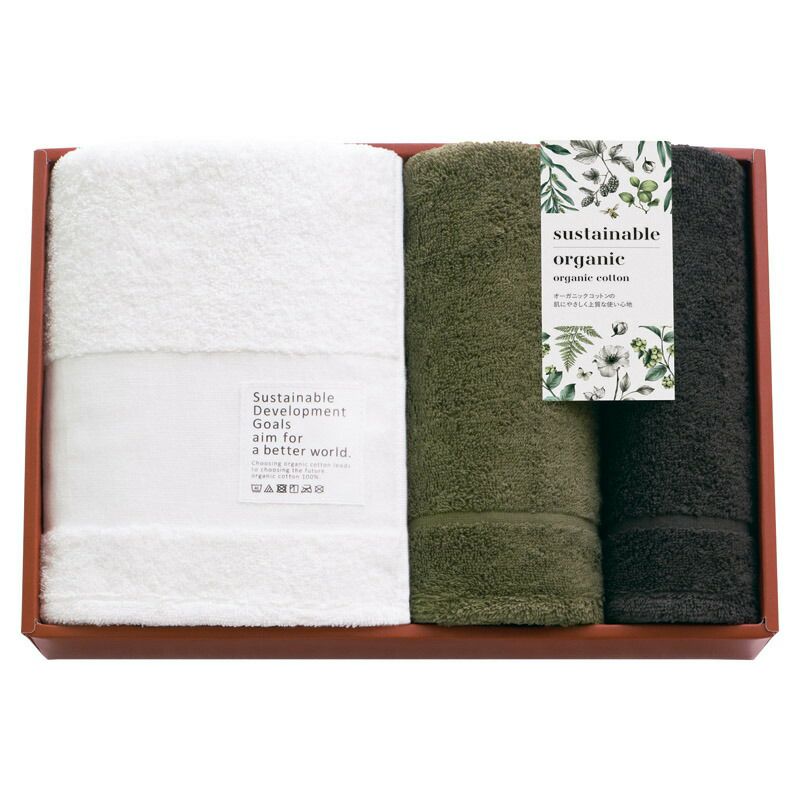 バスタオル(約600×1200mm)・フェイスタオル(約340×850mm)・ハンドタオル(約340×340mm)×各1 ■材質:綿100%(オーガニックコットン100%)