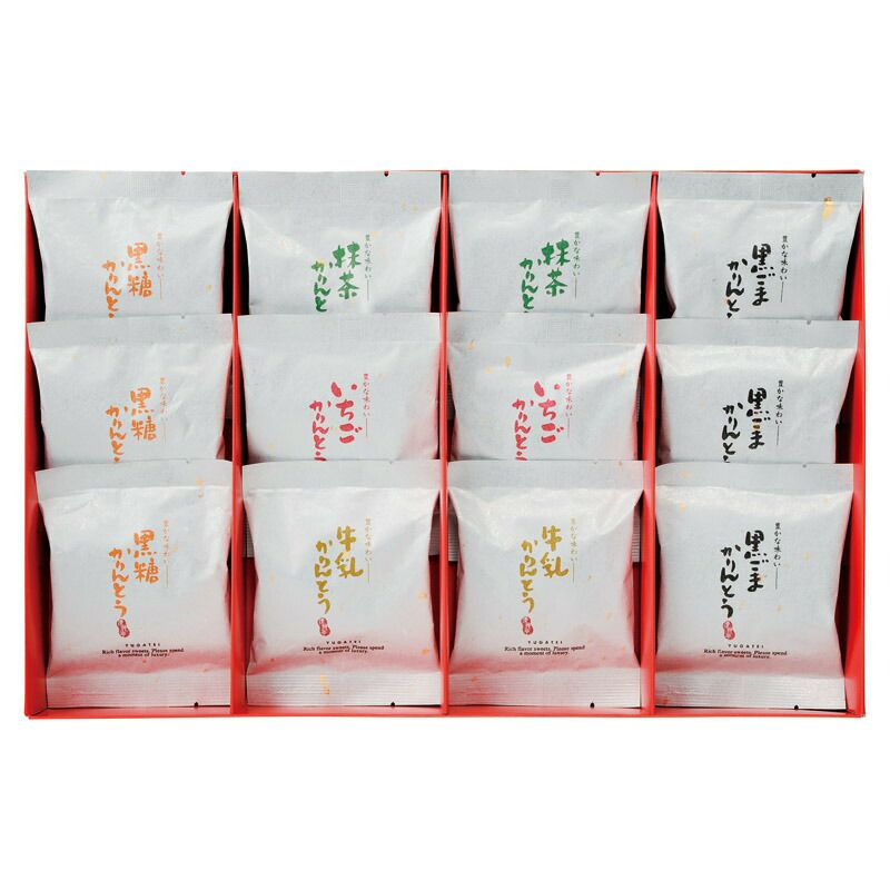 黒糖かりん糖(約10g)・黒胡麻かりん糖(約10g)×各3、牛乳かりん糖(約10g)・抹茶かりん糖(約10g)・いちごかりん糖(約10g)×各2 ■アレルギー:乳・小麦