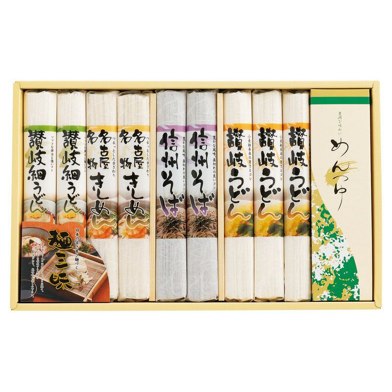 讃岐うどん(約150g)×3、讃岐細うどん(約150g)・信州そば(約120g)・名古屋名物きしめん(約150g)×各2、めんつゆ(約25g)×6 ■アレルゲン:小麦・そば