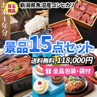 コシヒカリ1年分をメインにこだわりの景品をセレクトした景品15点セット【一部商品引換券】【多点数】【送料無料】のレビューを書く